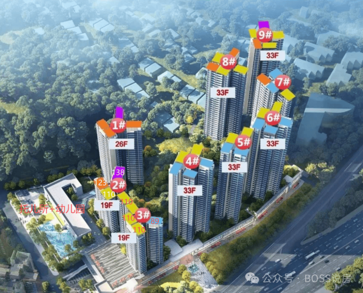 项目主要有9栋小高层和高层塔楼组成,呈半包围状分布,项目依山而建,整体抬高 11 米设计,并且以商业配套为首层,小区门口就是12班幼儿园和2班托儿所