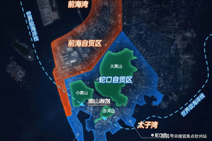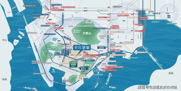 【约3.2平方公里 世界海洋科技创新先导区】在大的蓝图下,中国南山以同步世界湾区的规划理念,打造“前港-中园-后城”的城市格局。并依托3山1海的资源禀赋优势,以“两环、三心、三轴、六大街区组团”的蓝图规划,打造屹立深圳湾区的世界半岛生活。