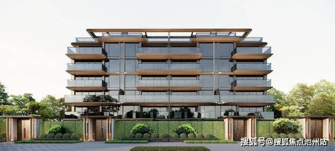 高层楼幢以大面玻璃+香槟金色铝板为立面主建材,金色线条从顶冠向下延伸,勾勒出建筑的挺拔轮廓,彰显出简约而现代的视觉冲击力。
