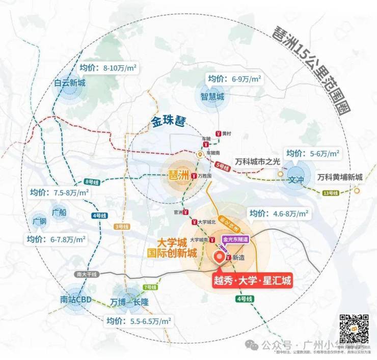 ②琶洲约15万+/㎡,金融城约13万+/㎡,大学城约8万+/㎡,国际创新城仅约4万/㎡,未来发展潜力大
