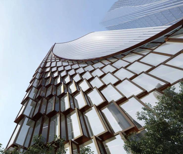 外立面是 UNStudio做的龙鳞幕墙和杭州裙摆,来福士也是UN设计的,未来江两岸遥相辉映。杭州裙摆将大平层、安达仕酒店和自持超甲级写字楼连成一体,T1和T2通过高差,在裙摆下形成了围合住区,这种室内外交融的灰空间,是杭州绝无仅有的国际化体验。