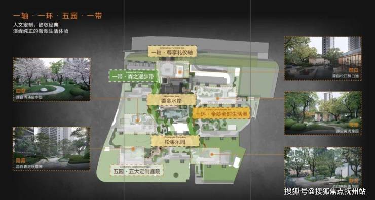 以海派里弄文化为鉴,社区景观中轴为主线,打造无界水院、鎏金水岸和松果乐园三个主题景观轴线。