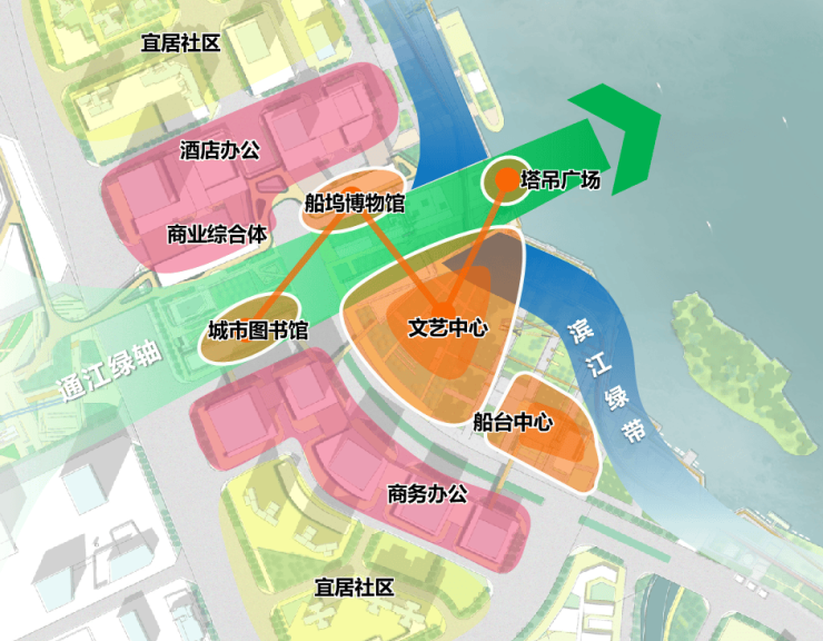 规划将活化船厂利用船坞船台,整体以通江绿轴形式,利用下沉广场规划城市图书馆、下凹空间新建船坞博物馆、珠江岸旁打造塔吊广场。滨江船厂原址主题公园集市民花园、文化公建、便民商业一体,整体形成了具广船历史韵味、沉淀城市记忆、又充满未来感的多元文化空间。