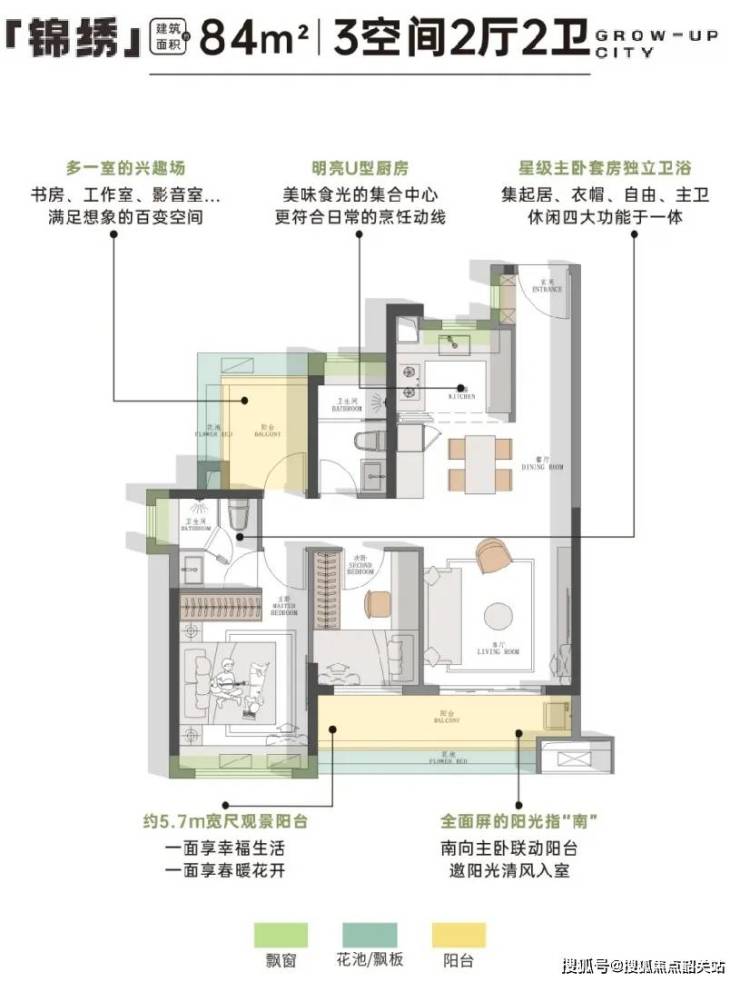这套户型,约2m进深阳台,搭配三边采光布局,采光性做的不错。