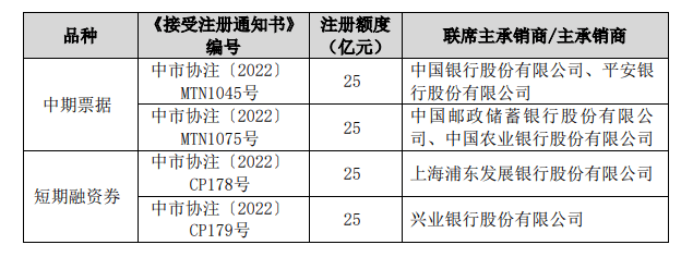 其中,中期票据注册额度合计50亿元,短期融资券注册额度合计50亿元。