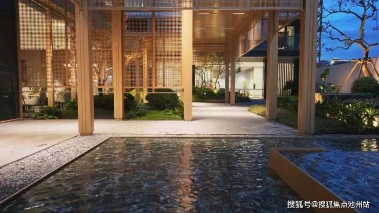 与这片水景连在一起的,是一条精致的游廊,金属格栅和镂空花纹设计,让它有种光影朦胧的美感,水景边上还专门嵌了一个下沉式空间,这就不只是路过的风景,而是可以坐下来好好欣赏的美景。这样让人感到松弛的空间,园区里还有很多。架空层的吧台、茶室和小包厢等多功能休闲空间,