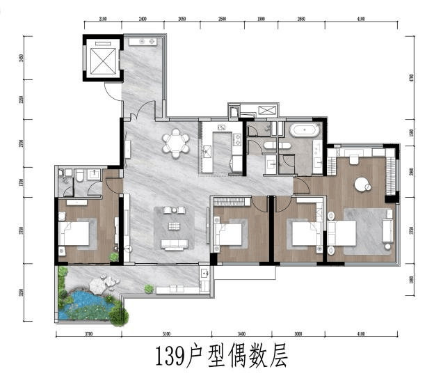 139㎡户型实现所有房间朝南的南向五开间格局;双套房设计,主卧套实现南北通带独立衣帽间,主卫五件套布局。