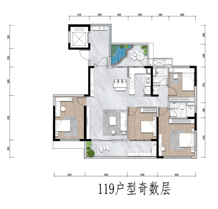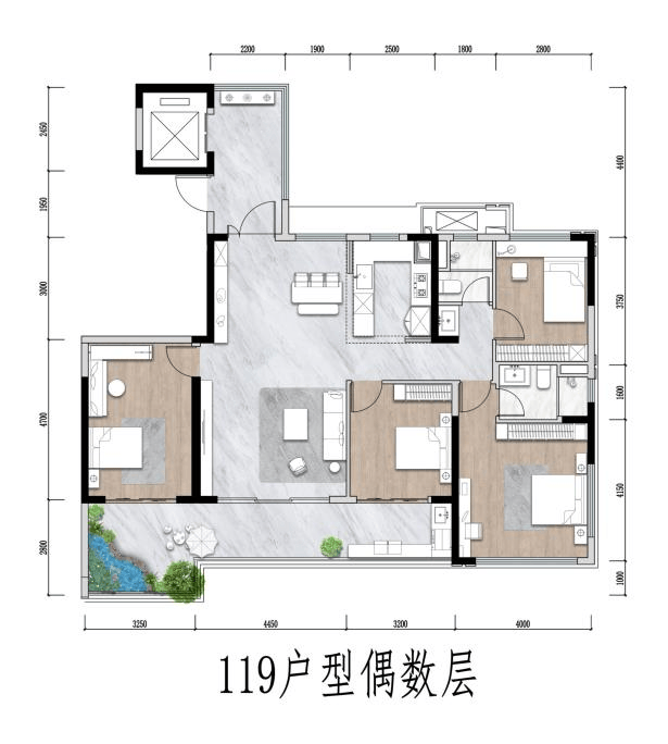 119㎡户型采用南北空中花园错层设计,奇数层的北向空中花园和餐厨空间结合,打造出惬意的下午茶空间;客厅与次卧可灵活打通,形成面宽超7.6m的大方厅。