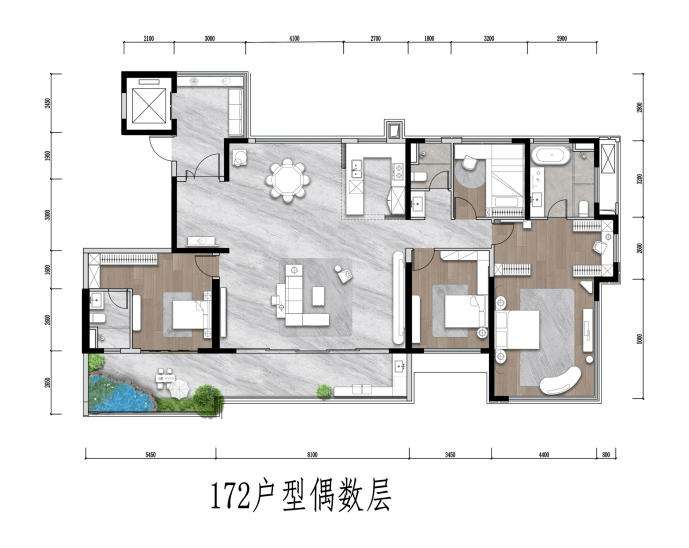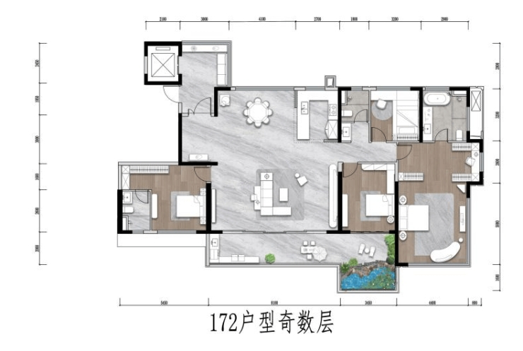 172㎡户型在此基础上进一步提升,配有独立玄关空间;8m面宽巨幕客厅,可改造为五房户型。
