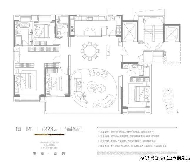 约130㎡的会客厅,奢华感十足!南北向各两个卧室,得益于超优化的空间利用和奢华设计,一家人居住,也可以舒服自在。