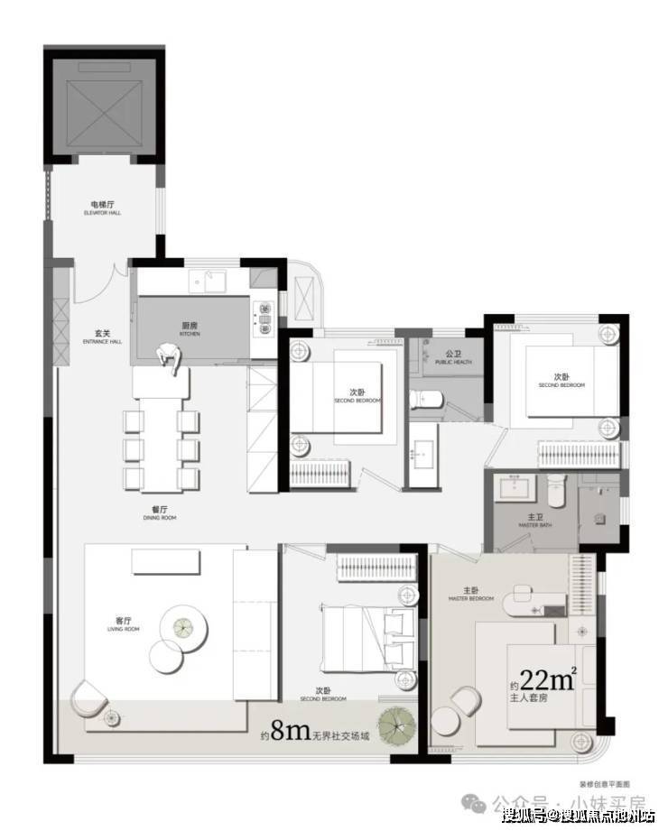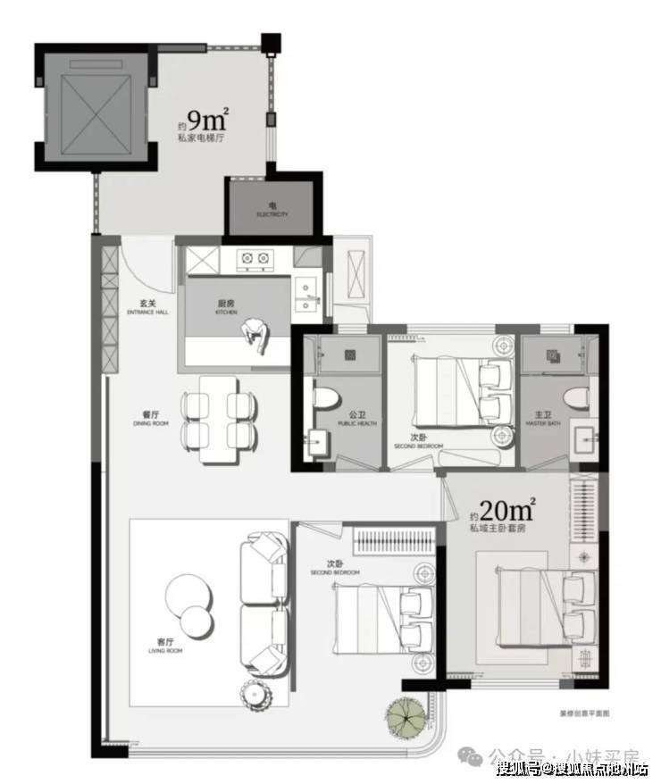 出电梯有一块约9平米的电梯前室,后期可以利用起来;客厅开间约4.1米,阳台开间约7米,并且还带270度转角视野,因是毛坯交付,后期也可以自己改造成为7米开间的大横厅;主卧面积接近20平,这对于传统90多平户型来说几乎是不可能做到的,但现在在准四代金地大成乐府里面做到了。