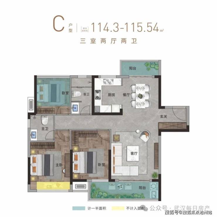 1、5、6、7#C户型建面约114-116㎡