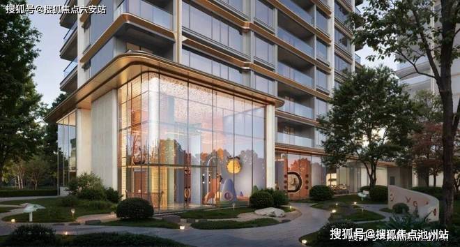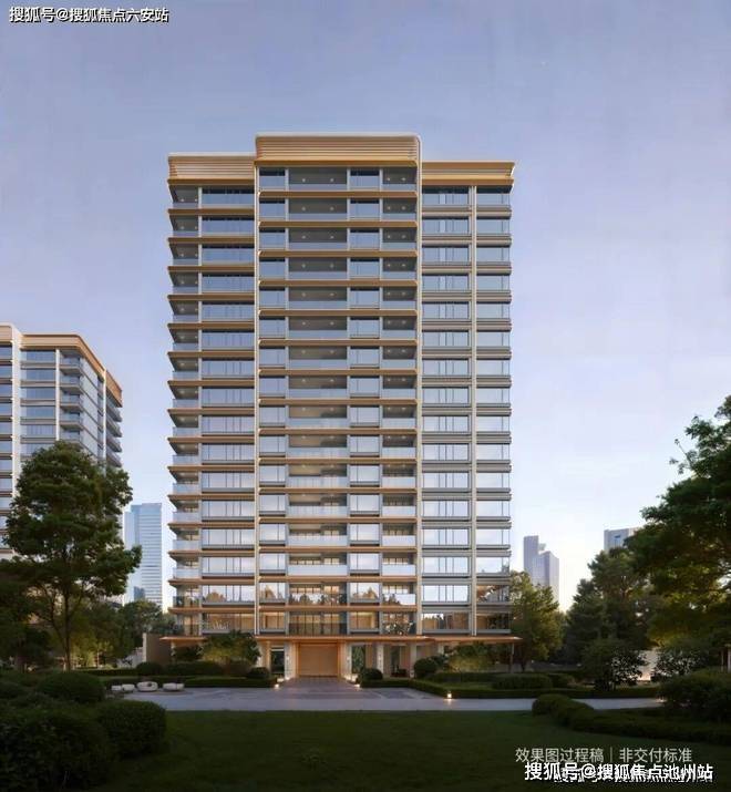 潮映杭园的建筑外立面采用铝板搭配大面玻璃和金色格栅顶冠,公建化立面设计展现出现代简约的美学风格。外立面材质选择上,项目选用玻璃、金属板材和石材,拒绝使用涂料或面砖,保证了立面的持久如新。