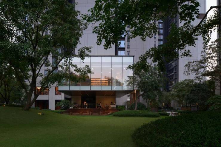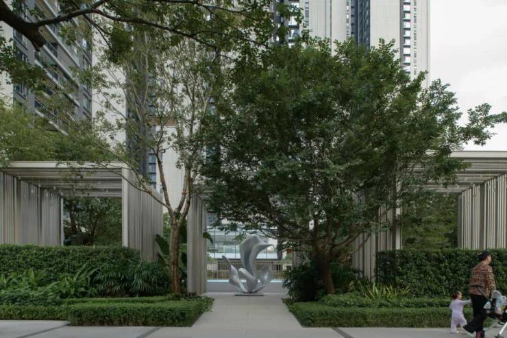 第二进组团花园内设有充满度假氛围的泳池、休憩凉亭以及精致的艺术雕塑,这些元素不仅构成了归家途中的一道仪式感满满的风景线,也与度假花园的空间理念相呼应,形成了完善的配套设施。此外,艺术化的玻璃体块与外部的泳池相互映衬,使得整个空间在视觉上更为立体饱满,充分满足了三千多户居民的日常活动需求,营造出一个既实用又美观的公共休闲区域。
