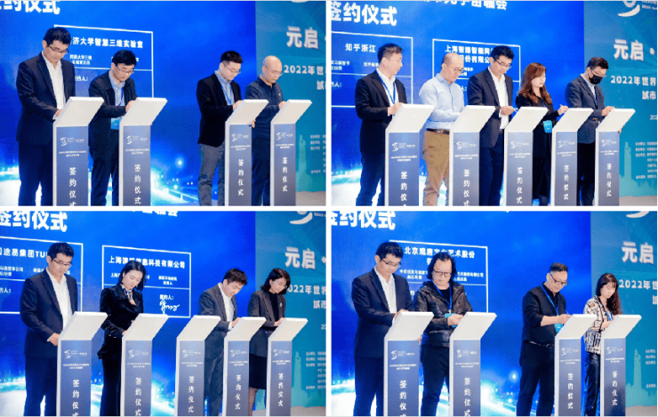 咖荟现场进行了四组11项合作签约仪式,签约单位有中交系统的机电局第三工程有限公司、中交投资桐乡乌镇智享数字科技有限公司、阿里云嘉兴公司、知乎城市浙江运营中心、上海智臻智能科技有限公司、绿城科技、欧联节能建筑、德国途易集团、上海清博信息科技有限公司、中民协元宇宙工委、同济大学三维实验室、中国美术学院跨媒体学院、杭州回响空间文化艺术有限公司。