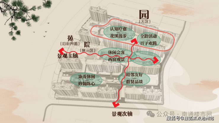一环: 健康跑道;两轴: 主入口景观轴、次入口景观轴;五景:休闲会客-西窗观景,康养休闲-修髓练心,睦邻友好-群贤品谈,认知疗愈-花溪漫步,全龄活动-百子欢腾。