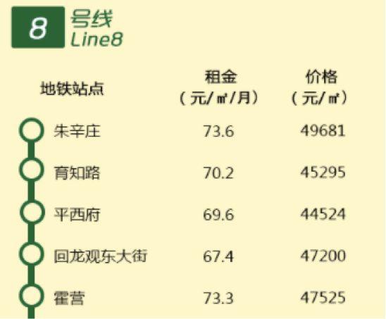 据云房中心数据,2019年二季度8号线朱辛庄站周边的租金为73.6元/平米/月,区域二手房成交均价为49681元/平米,而从朱辛庄向南4站地铁站周边的房租和二手房均价,均不及朱辛庄。