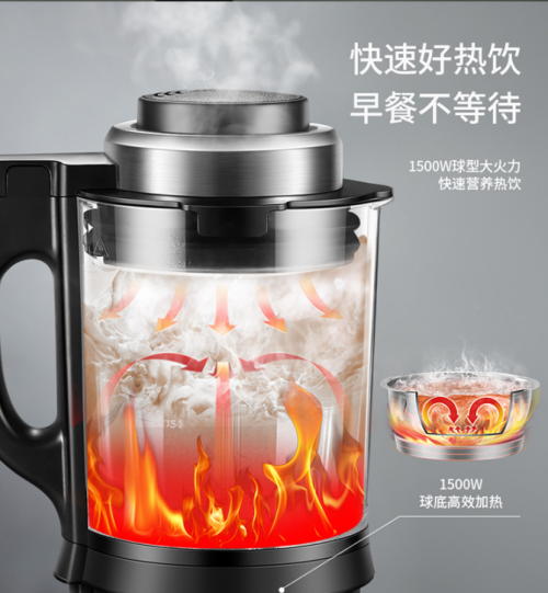苏泊尔静音破壁机-SP18S的“球底大火力速热技术”,使用行业首创的1500W球形大火力,将加热效率提升47%,高效加热不在话下。