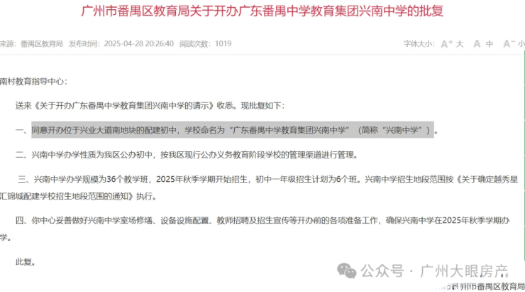4月28日晚,广州市番禺区教育局发布公告,同意开办位于兴业大道南地块的配建初中,学校命名为“广东番禺中学教育集团兴南中学”(简称“兴南中学”)。