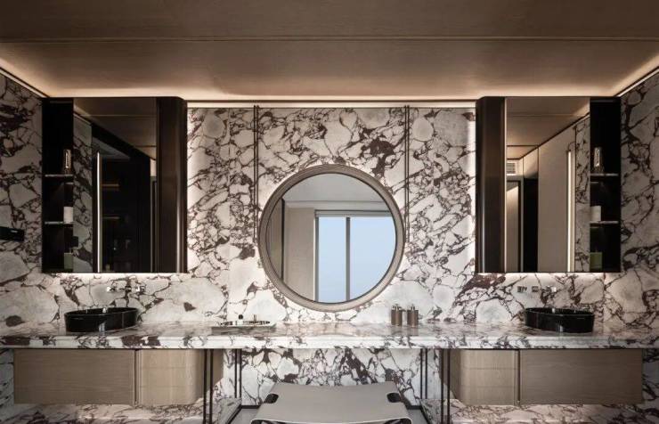 270°環景的超尺度主臥套房中,設計師設定一處“sunset corner”。細膩的筆觸投嚮主臥,日光透過窗外欄柵傾斜而至,這便是設計師想要體現的閑適淡雅。