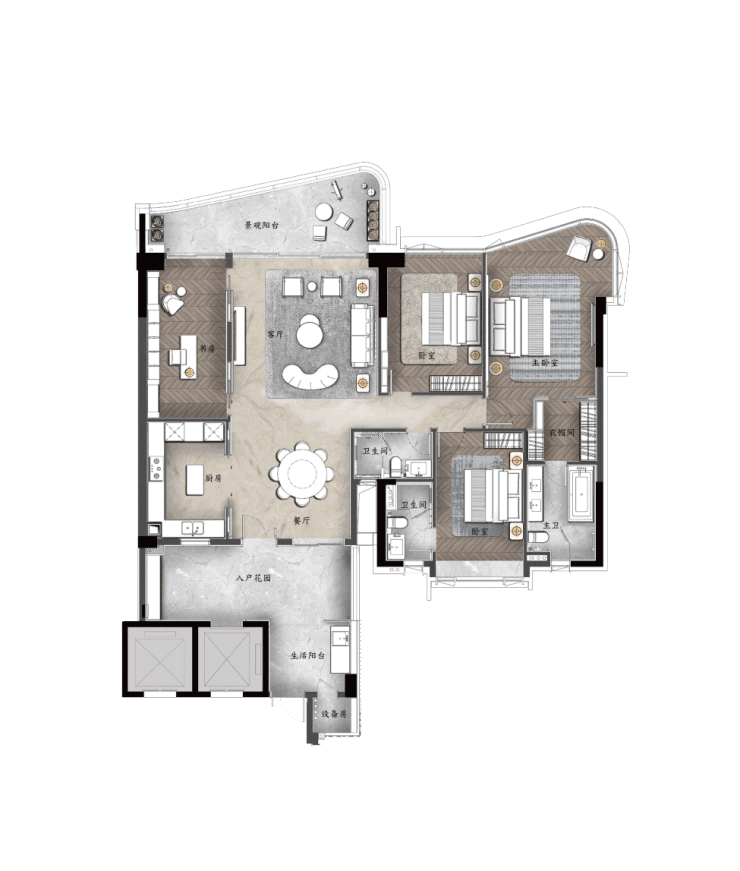作为270㎡王牌户型同款,约250㎡户型拥有超大入户花园、直面巨幕江景、270°环幕看江,带来颠覆体验,空间也要更精简实用,门槛也更低: