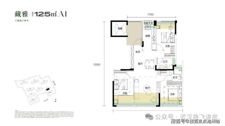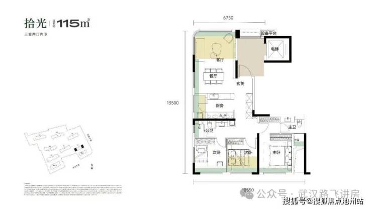 ①115㎡户型:三房两厅两卫,1号楼端头边户,3个卧室朝南,餐客厅一体全景舱设计,客厅为北、西(或东)两面采光,带独立电梯前室。户型的结构是仿照豪宅设计的,但面积却非常小,次卧、厨房、客厅均有阳台优化面积,此外飘窗优化面积也较多,部分空间阳台外部预计是有花池作为全赠送面积。