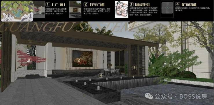 【社区迭代】复刻余荫山房设计的岭南园林,融入广雕、千年广绣、广府花窗设计,如广雕对景照壁源于余荫山房抽 象龟纹石雕,寓长寿之意、镇宅安宁;广府花窗,寓意满堂富贵等,代表广府的美好祝愿
