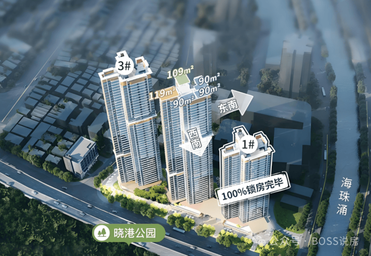 产品优质:建面 88-117㎡三到四房户型,新规设计,使用率可达 120%,西南向正对晓港公园,景色优美。