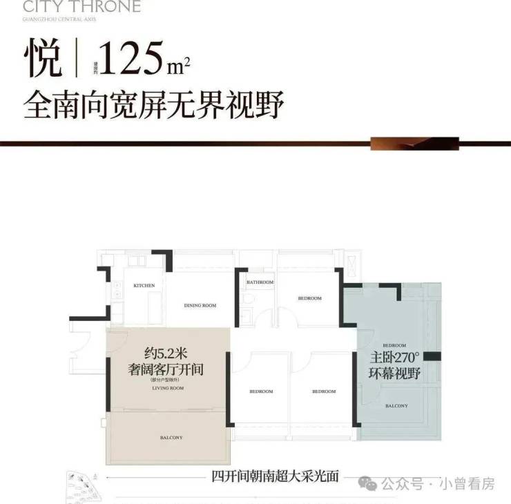 其三,270°飘窗+约8.4米南向巨幕阳台+双南向套房,户型很惊艳这个户型,四开间朝南,也是改善客户的首选。