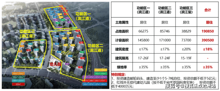滨江道/玺项目由3个功能区组成,整体占地19万方,总计容面积39万方,纯居住属性, 须签署投资协议在红线外投资建造邮轮码头,投资总额不低于5亿元;无偿代建幼儿园(按不低于省优质园标准实施),投资总额不低于4000万元。项目成交总地价约58.69亿元,折合楼面价约15029元/㎡;含固投总地价约64.09亿元,折合楼面价16412元/㎡。