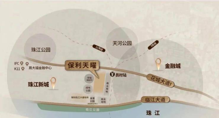 尤为值得一提的是,这是天河比较难得的靠近地铁站的盘,地块东北侧距离地铁5号线与11号线交汇的员村站仅150m,5号线+11号线可以连通广州最核心的几个商务圈---珠城、琶洲、天河北、白鹅潭等等,通达性很强。