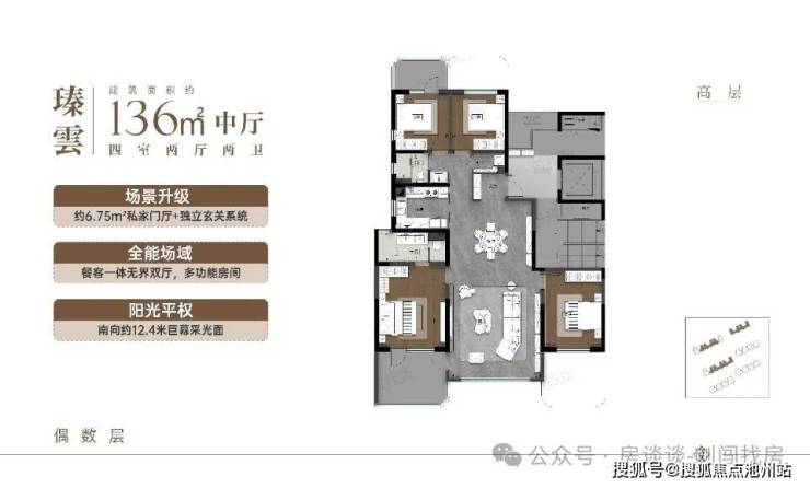 高层:136㎡四房,环幕端厅设计(边户客厅开间 7.3 米),奇偶错层小露台,精装交付