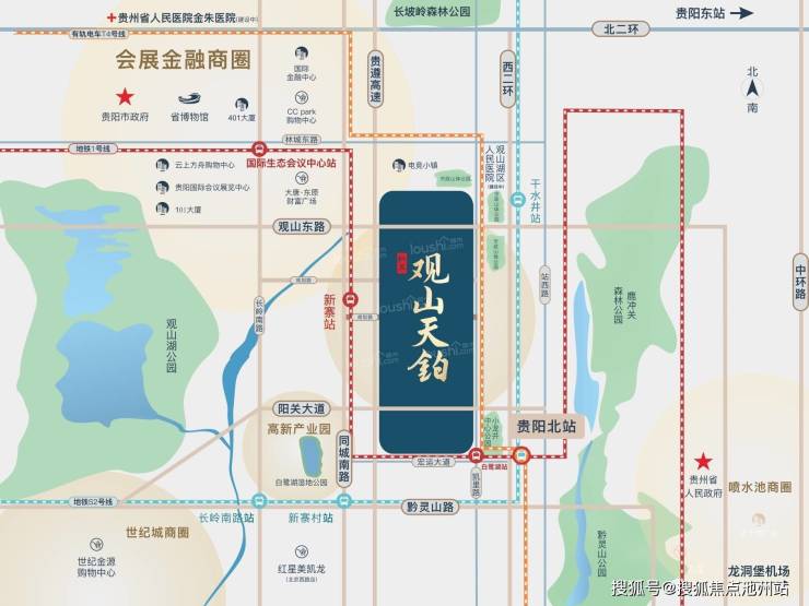 交通配套:项目坐拥“一电两轨三横四纵临高铁”的立体交通体系;有轨电车T4号线;地铁1号线白鹭湖站、新寨站双地铁口环绕,S2号线贵阳北站临近项目(规划中);林城东路、阳关大道、观山东路东西连接项目;西二环、同城南路、贵遵高速、长岭南路快速实现与各个区域的驳接;