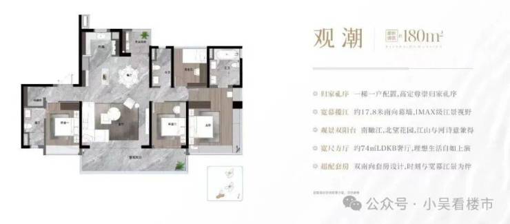 产品上,外立面采用大片玻璃幕墙,实现南向大面宽望江,比如,清一色三梯三户/四户设计,拥有阔尺仪式门厅、独立入户玄关,比如,新规高使用率产品,加上大师定制空间,更将大宅感发挥得淋漓尽致,南向大面宽,阔尺南向瞰江阳台、270°窗景,配置中西双厨、LDKB社交方厅、酒店式套房主卧、双阳台等,以奢阔尺度、顶配生活方式,致敬城市峯层。