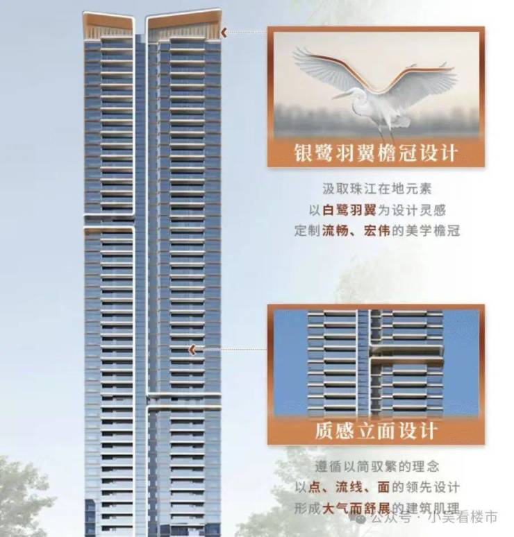 此前,这种立面一般会出现在10万+/平的项目,而珠江春,结合银鹭羽翼檐冠设计,勾勒出灵动通透的外立面,沉稳又不失大气。