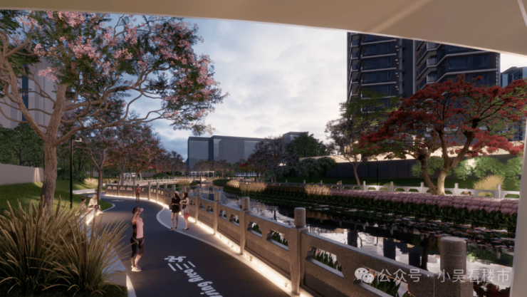 在连接狮山公园和社区的活力水岸中,珠江春提前预设了一系列情景场域,沿着水岸,项目一口气打造了2大网红桥,业主不需要外出,就能观赏一年四季的限定浪漫。