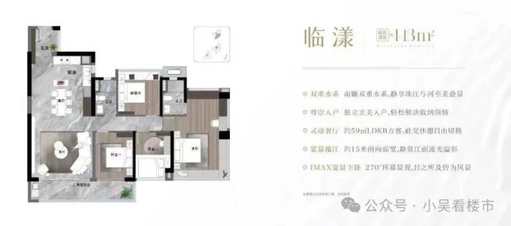 建面144平,只有6栋两条梯腿,总共82套,客厅与旁边灵动空间打通后,可以做到59平的阔绰空间,四开间约15米的南向采光面,南向视野与其它楼栋遮挡较少,这个户型10楼以上就能无遮挡望江了。