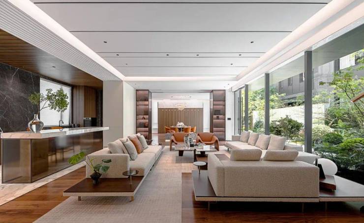 首层约4米挑高大堂气势不凡,L型格局构筑双大堂空间,可根据需求灵活布局空间,礼仪前台来客接待细节之处见尊崇。