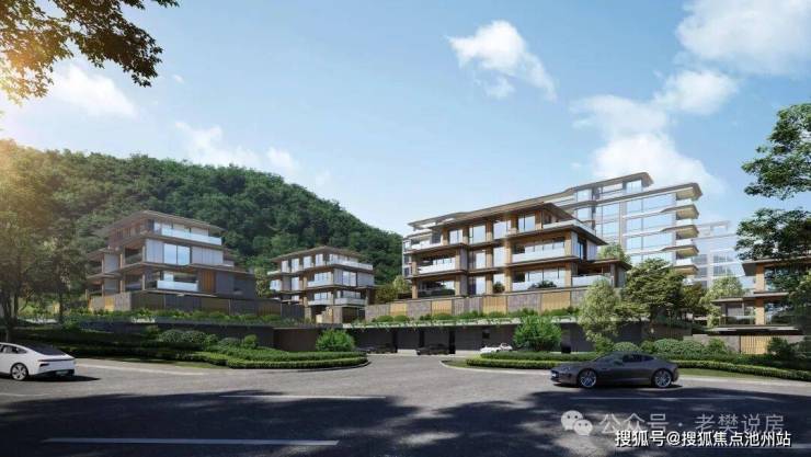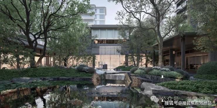 以南宋《江山秋色图》为灵感,师法《园冶》营造精粹,萃取北方青绿山水之韵与宋式文化精粹,打造宋代官帽式山门(山门整体界面底面选用蓝眼睛超规格石材,大门两侧参考上海阿丽拉酒店的高奢设计理念,以大块自然山石拼接造型)、莲桥锦鲤、水帘飞瀑、天青山房等景观空间,实现归家路径与景观节点的有机串联,以“山谷谧院·共话泉林”的生活图景,让居者沉浸式体验“上山入谷·溪畔栖居”的生活意境。