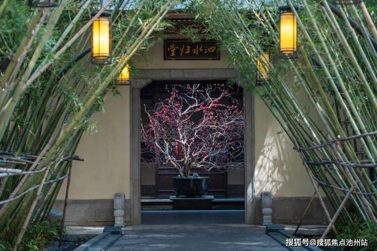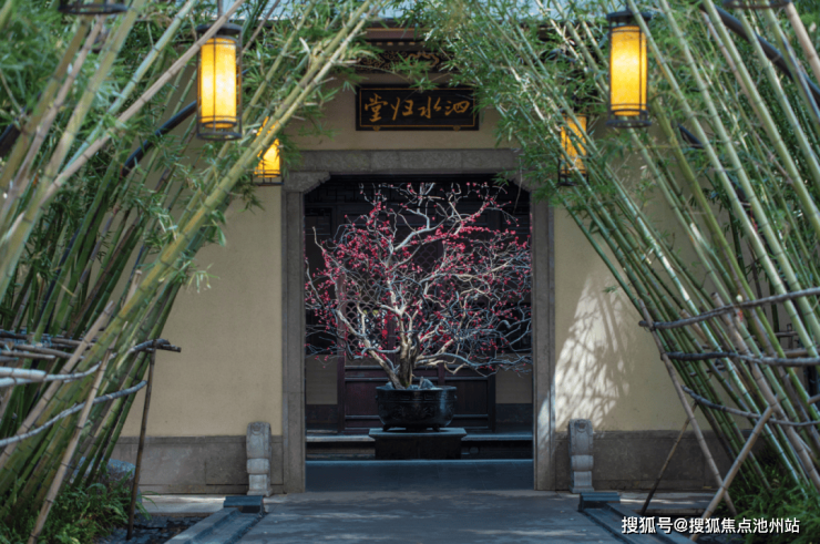 迈入门庭,在翰林九境府内,藏着一座惊艳的中式园林,影壁回廊通过层层窗棂,营造视觉空间的层次感,穿行而过,只见竹林夹道接引泗水归堂,以石门为框,门内红梅为景,拉开一幅充满禅意的写实画卷。