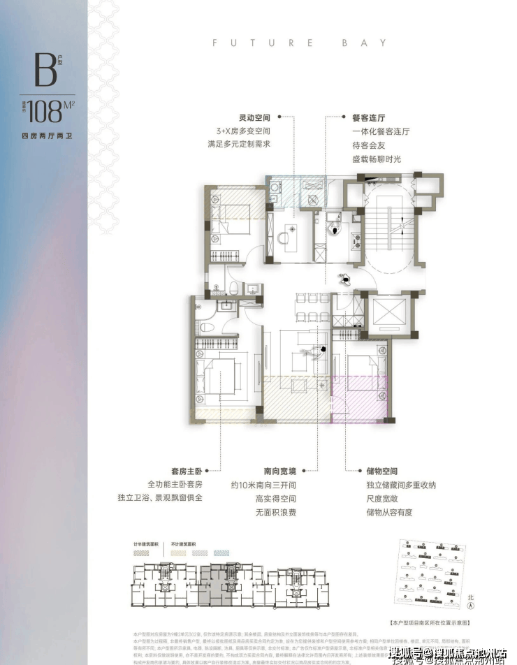建筑特色:采用现代东方美学设计,一梯两户,全封闭阳台,部分房源层高3.1米,架空层高4米,车库层高约5.9米。