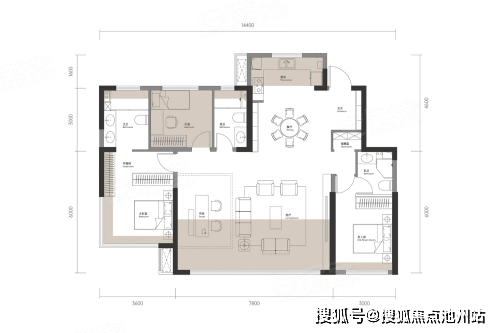 建面约122㎡三房两厅两卫,南向面宽约14.4米,客厅开间7.8米,可以保留大横厅设计,也可以改造为客厅+书房;南向次卧尺寸符合传统主卧布局,且也是套房设计,是非常舒适的双套房,可以改造为四房三卫。