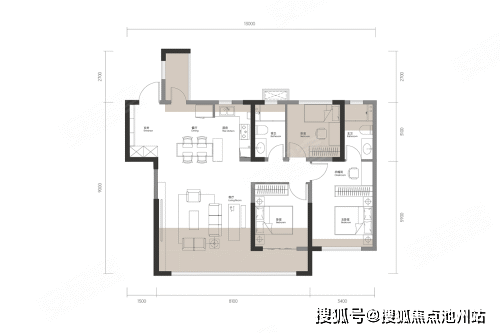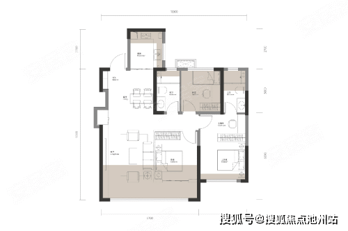 建面约95㎡三房两厅两卫,三开间朝南,南向面宽约11.5米,更大一些。客厅开间做到了约5.1米,也可以加一张开放式书桌,改造为3+1房。餐厅外面还带阳台,南北双阳台设计。