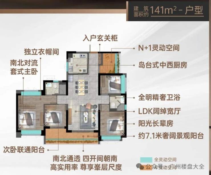 141平户型五房,7米长阳台,南北对流,主卧双采光通风设计,270度园景无遮挡,独立卫生间、衣帽间,LDK设计,