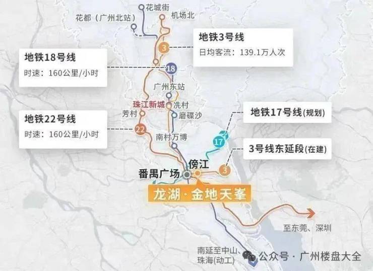 1、交通:项目门口旁就是3号线东延段傍江站地铁上盖,可直达珠江新城和白云机场。一站番禺广场,在番禺广场接驳18号线和22号线,另外规划中有17号线。