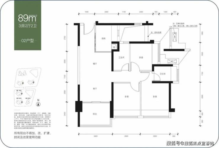 建面约89-90㎡,三房两卫,两者户型结构基本一致,都是动静分区结构,相比之下,89㎡户型动区面积小一点,90㎡是静区面积小一点,总的得房率差距很小,整体尺度比较舒适,经典实用型产品。