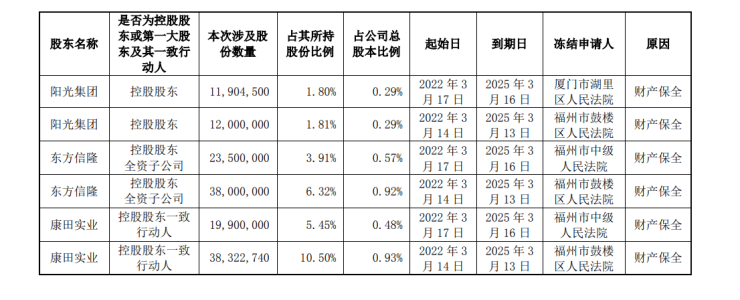 根据公告,阳光城集团股份有限公司于 2022 年 3 月 21 日收到公司控股股东福建阳光集团有限公司、全资子公司东方信隆资产管理有限公司、控股股东一致行动人福建康田实业集团有限公司的通知,获悉其所持有公司的部分股份被福建省厦门市湖里区人民法院、福州市鼓楼区人民法院、福州市中级人民法院司法冻结。