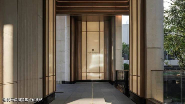 步入4米宽的归家走廊,外侧可以看到百年榕树与榕树广场的盎然绿意,静谧自然的氛围扑面而来。内侧以透光石材吊顶与装饰墙面营造奢雅质感。回望10米高的门头,空间的序列感与仪式感相互交织,构筑出温馨而尊贵的归家体验。