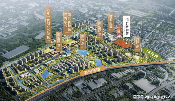 ② 本项目西侧规划商业约1.4万方、南侧社区中心约1.4万方(含菜场约2100㎡、运动中心约2600㎡),且包含“人民坊”示范项目。将会打造成为江桥的核心商业之一。教育资源丰富、未来将引进国际化特色民办学校(规划中),同时规划了九年一贯制公办学校,家门口即可享受全龄段优质教育资源。约1.2km绿野谷(规划中)、迎虹湖(规划中)连接U型廊与一字川,构建起滨水城市界面。繁华与滨水同赏,重著国际湖居森活新样板。
