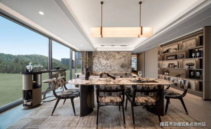 外立面与公区:采用 三面铝板+270°曲面玻璃(供应商为深圳南玻),顶部弧形塔冠设计,成本较常规住宅高约30%。示范区铺装 普拉达绿奢石超4000㎡,入口黑山石单块重26吨,泳池旁配6棵 加拿利海枣树(单棵价值8万+)。
